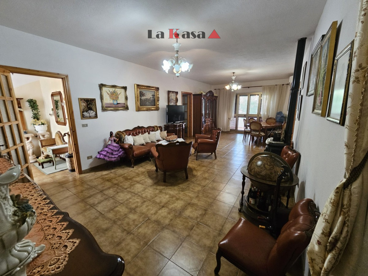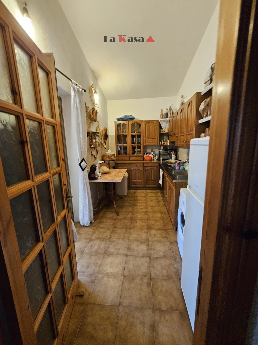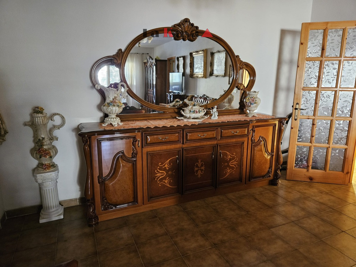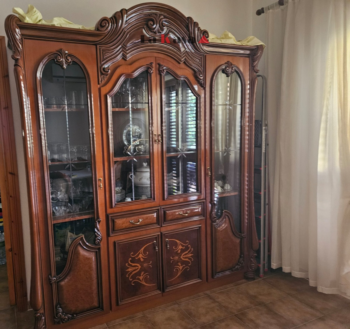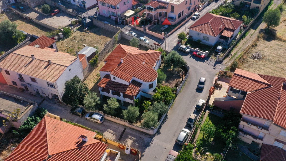 The 750 sqm garden is a green oasis with olive trees, persimmons, and pomegranates—symbols of abundance and deep roots. The villa itself measures 160 sqm and opens with a covered veranda leading into a grand entrance and an enormous living room: on one side, the relaxation area with sofas; on the other, the dining area with a large family table. The kitchen, separate and made of authentic wood, combines warmth and practicality, with access to another covered veranda perfect for outdoor meals.