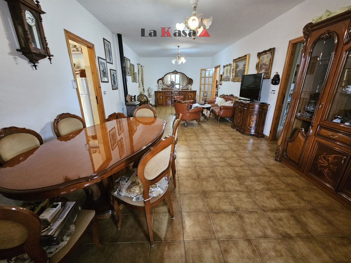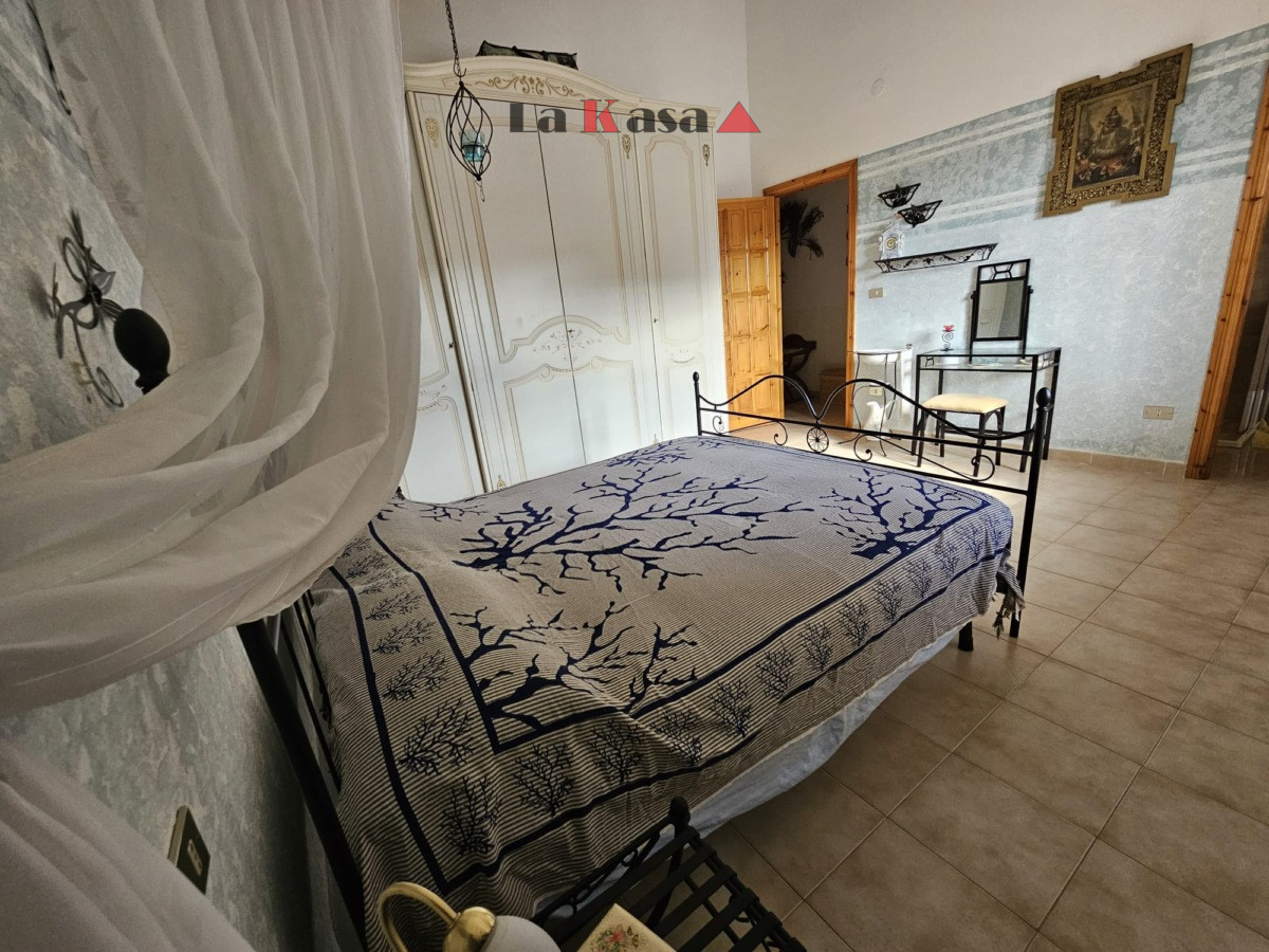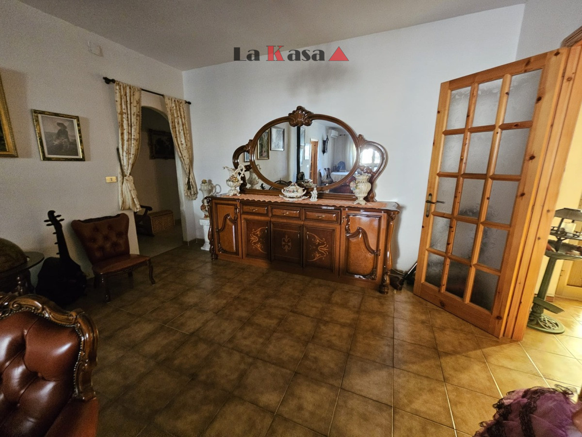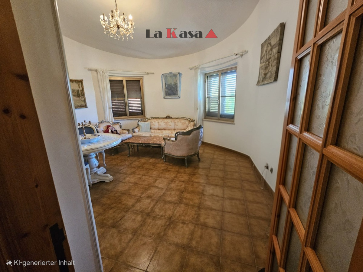 The 750 sqm garden is a green oasis with olive trees, persimmons, and pomegranates—symbols of abundance and deep roots. The villa itself measures 160 sqm and opens with a covered veranda leading into a grand entrance and an enormous living room: on one side, the relaxation area with sofas; on the other, the dining area with a large family table. The kitchen, separate and made of authentic wood, combines warmth and practicality, with access to another covered veranda perfect for outdoor meals.