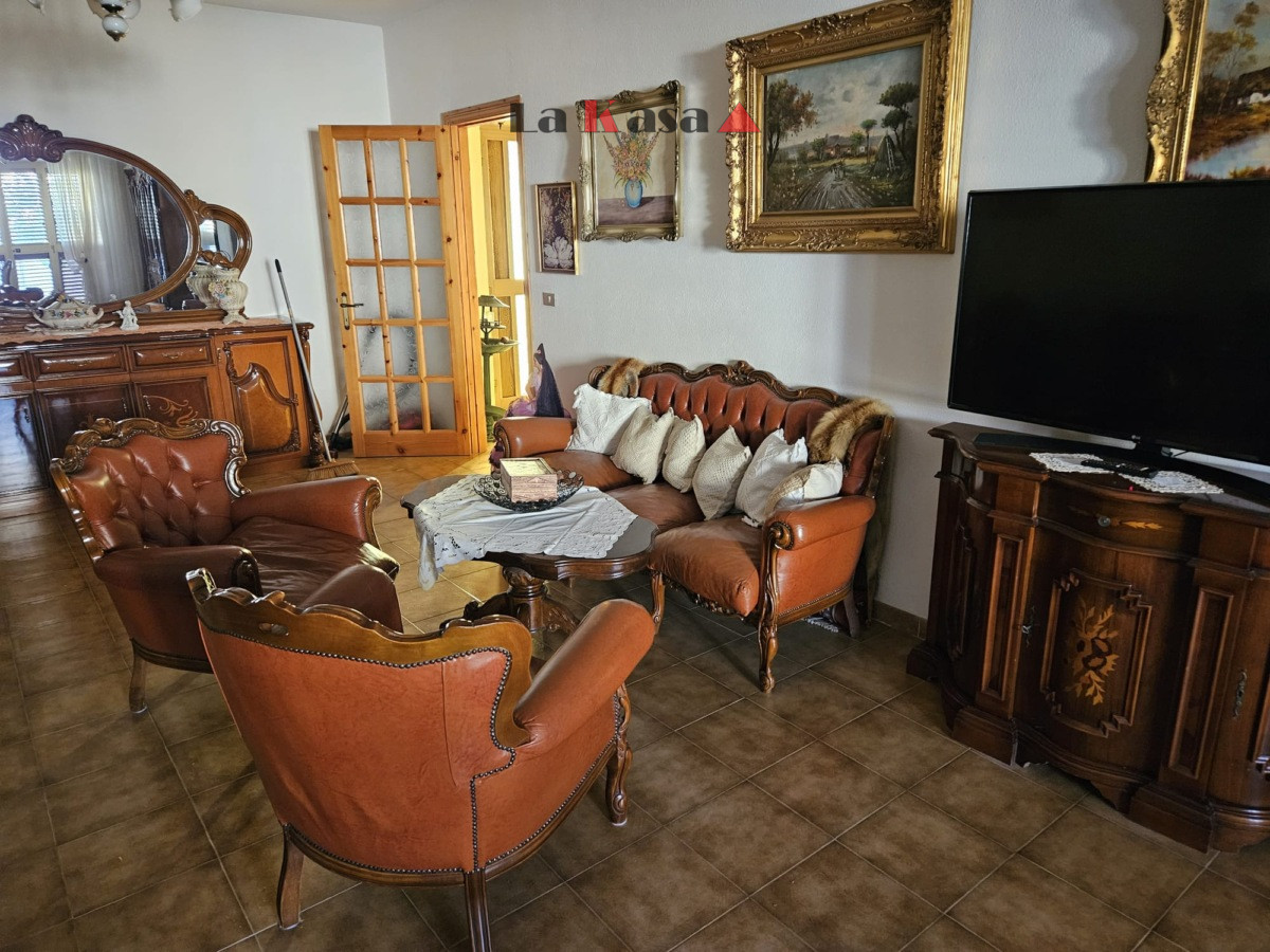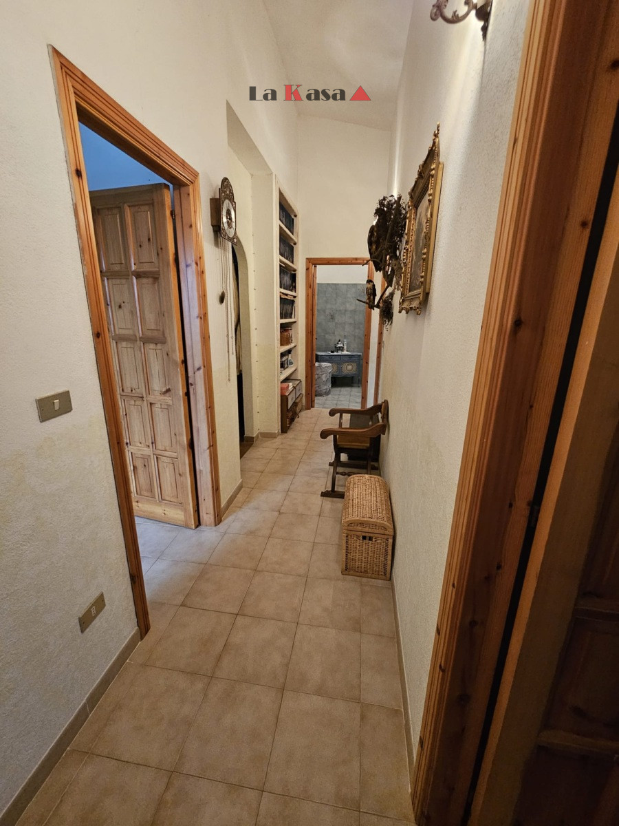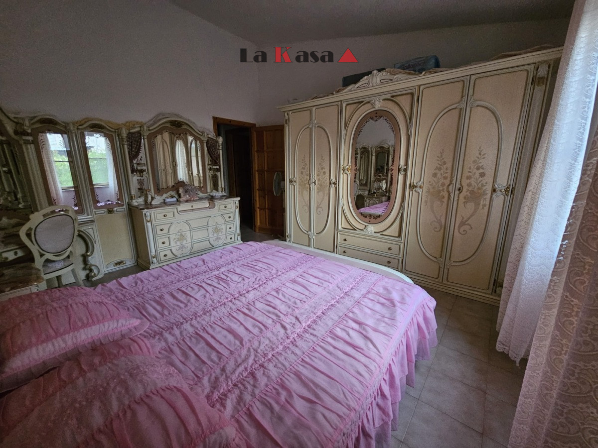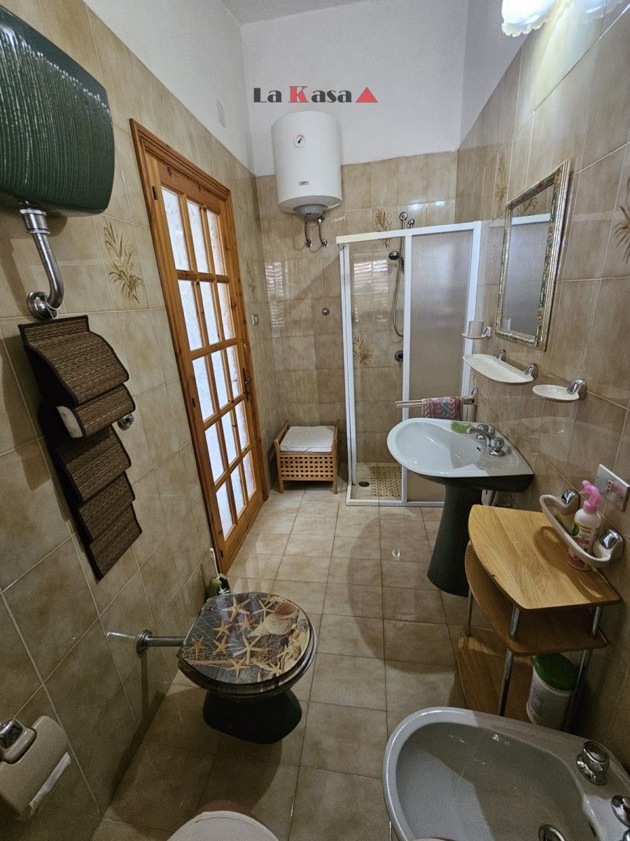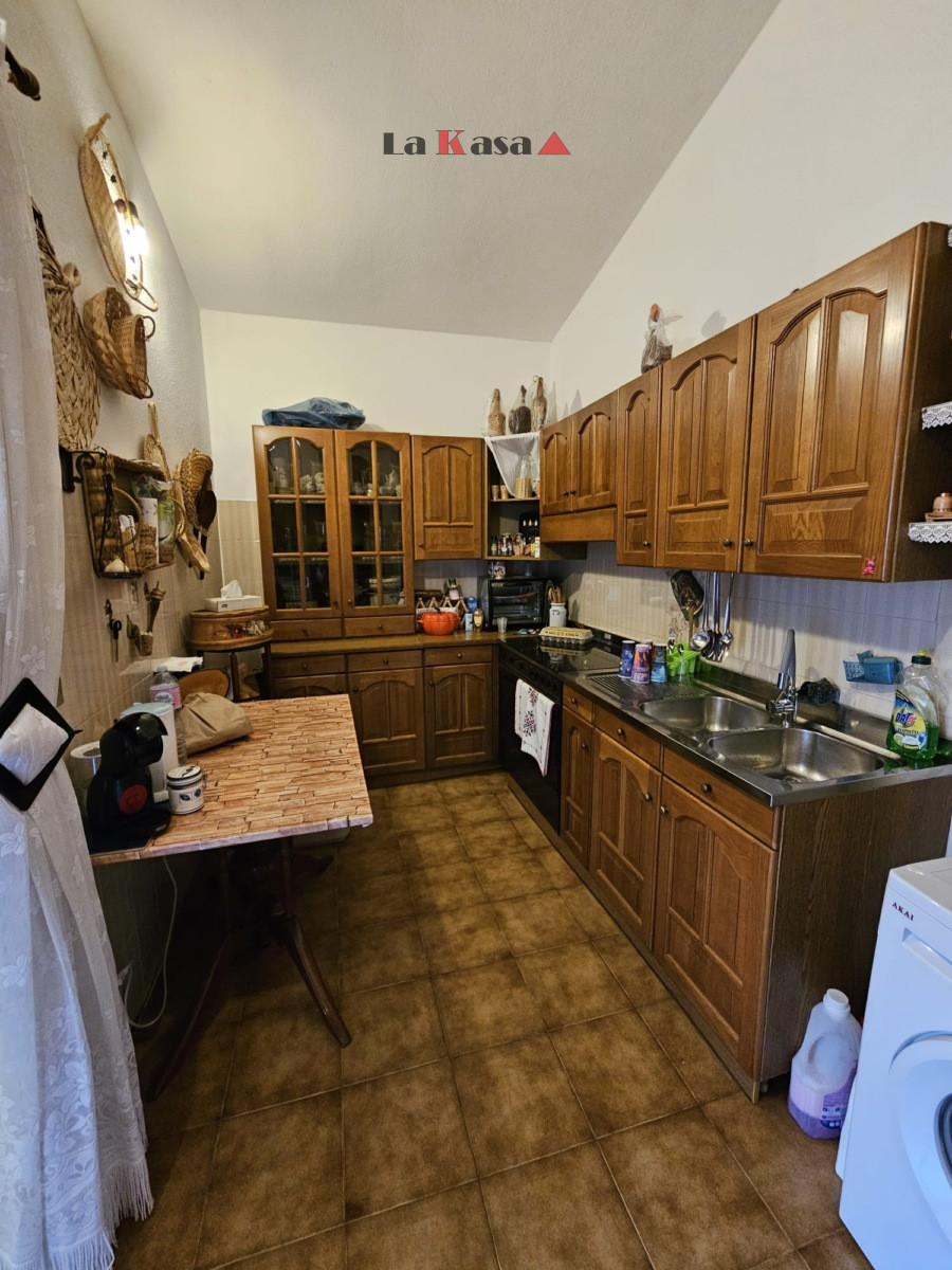 The 750 sqm garden is a green oasis with olive trees, persimmons, and pomegranates—symbols of abundance and deep roots. The villa itself measures 160 sqm and opens with a covered veranda leading into a grand entrance and an enormous living room: on one side, the relaxation area with sofas; on the other, the dining area with a large family table. The kitchen, separate and made of authentic wood, combines warmth and practicality, with access to another covered veranda perfect for outdoor meals.
